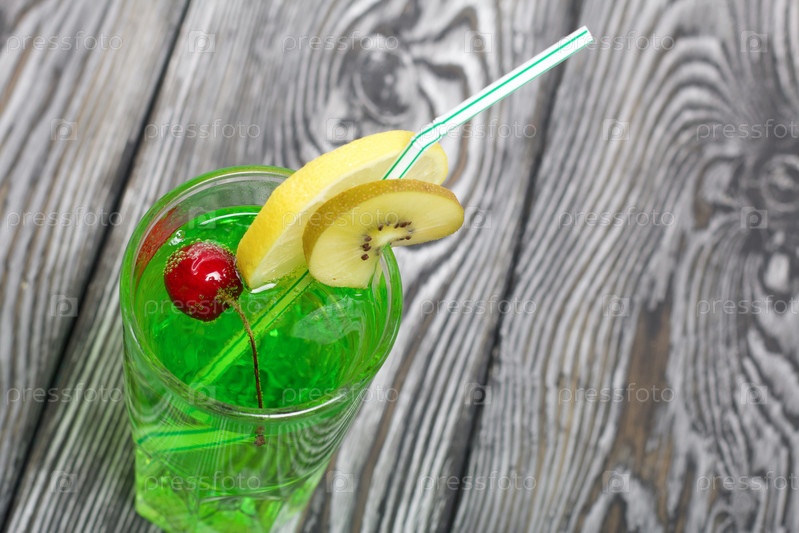 Зеленый лимонад в стакане. В нем плавает вишня. Украшен ломтиком лимона. С соломинкой для коктейля