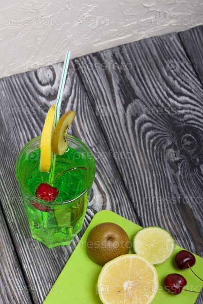 Зеленый лимонад в стакане. В нем плавает вишня. Украшен ломтиком лимона и киви. С трубочкой для коктейля. Рядом на разделочной доске лежат фрукты для коктейля