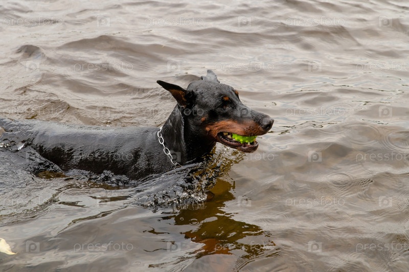Собака плавает в реке и несет мяч своему хозяину