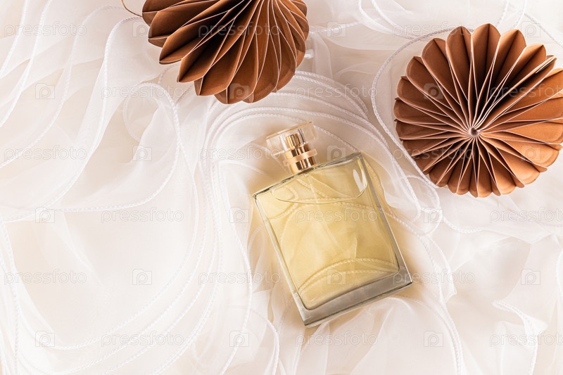 Шикарный флакончик духов без названия на игрушке из коричневой сотовой бумаги. Фон из бежевой шифоновой ткани. Новогодняя презентация аромата
