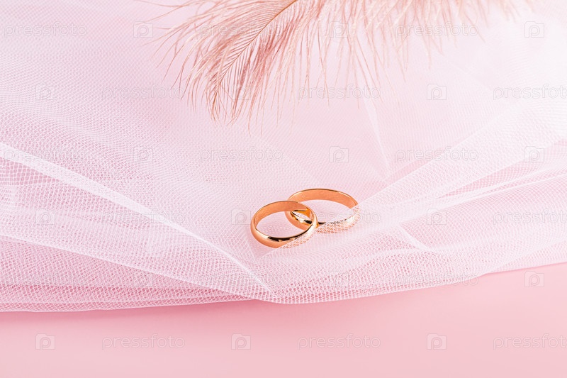 Два золотых классических кольца лежат в складках белой фаты невесты. Вид спереди. Место для копирования. макет, шаблон, приглашения, открытки, обои