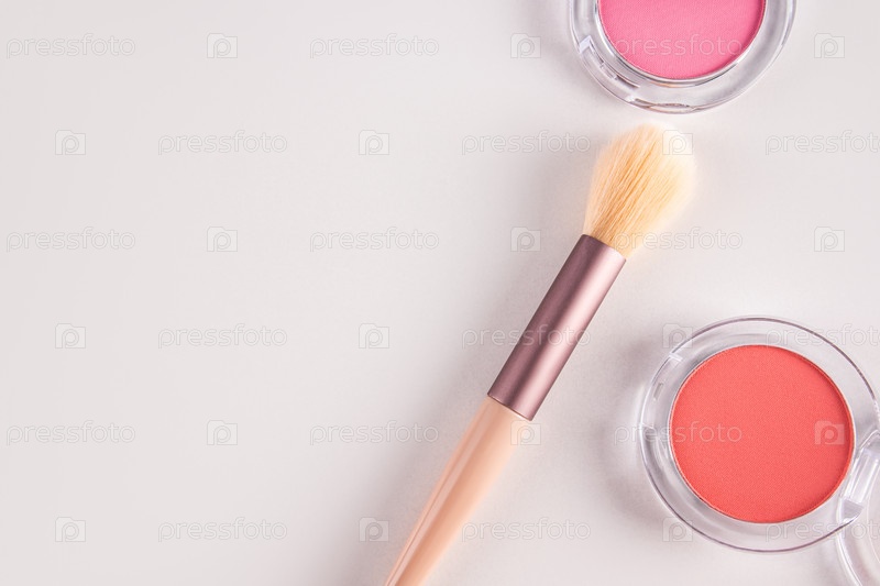Две круглые упаковки розовых и персиковых румян на белом фоне с красивой кисточкой для макияжа. вид сверху. Копия пространства. Концепция красоты