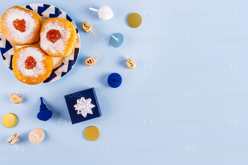 Традиционные угощения, символы праздника Ханука на синем фоне. пончики, дрейделы, шоколадные монеты для детей. вид сверху. Копировальное пространство