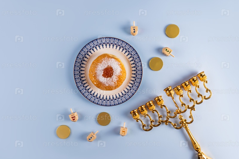 Концепция еврейского праздника Ханука. традиционные угощения, символы праздника. Золотой минор, пончик, дрейдлы, монеты. вид сверху. Копировальное пространство
