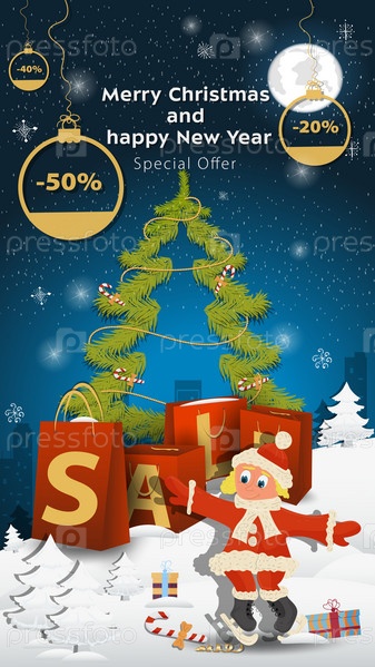 Специальное предложение Распродажная надпись в виде больших пакетов, стоящих на заснеженной поляне Девушка в костюме Санта-Клауса на коньках