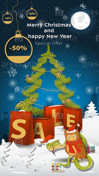 Специальное предложение Распродажная надпись в виде больших пакетов, стоящих на заснеженной поляне, змеи и совы в шапке Санта-Клауса
