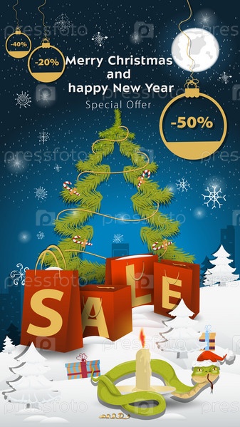 Специальное предложение Распродажная надпись в виде больших пакетов, стоящих на заснеженной поляне Змея в шапке Санта-Клауса обвивает свечу