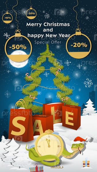 Специальное предложение Распродажная надпись в виде больших пакетов, стоящих на заснеженной поляне Змея в шапке Санта-Клауса обвивает часы