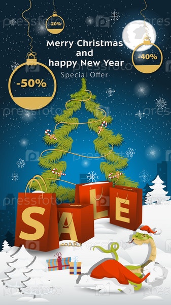 Специальное предложение Распродажная надпись в виде больших пакетов, стоящих на заснеженной поляне Змея выглядывает из-за шапки Санта-Клауса