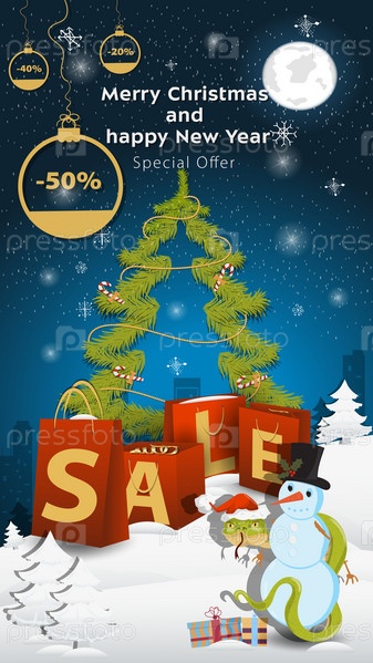 Специальное предложение Распродажная надпись в виде больших пакетов, стоящих на заснеженной поляне Змея обвивает снеговика
