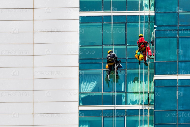Строительные рабочие, выполняющие техническое обслуживание или ремонт фасада здания. Высотные работы промышленного альпиниста
