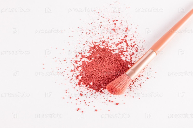 Элегантная профессиональная косметическая кисть лежит на розовых рассыпчатых румянах. текстура декоративной косметики. вид сверху. Копировальное пространство. белый фон