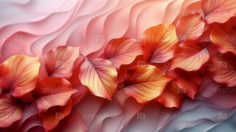 Абстрактный фон из ярко-красных и оранжевых листьев, разложенных на волнистой розово-бежевой текстурированной поверхности