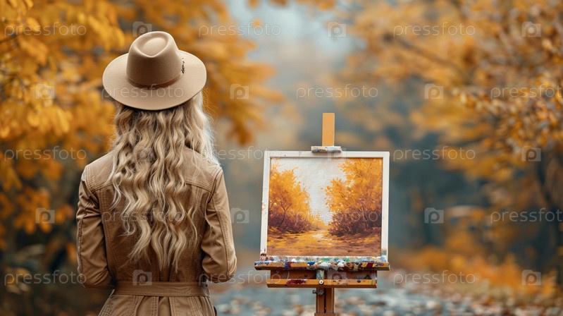 Блондинка в пустом осеннем парке рисует осенний пейзаж
