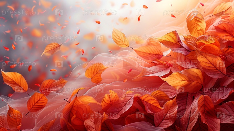 Абстракция из оранжевых и желтых листьев и прозрачной вуали, осенний абстрактный фон