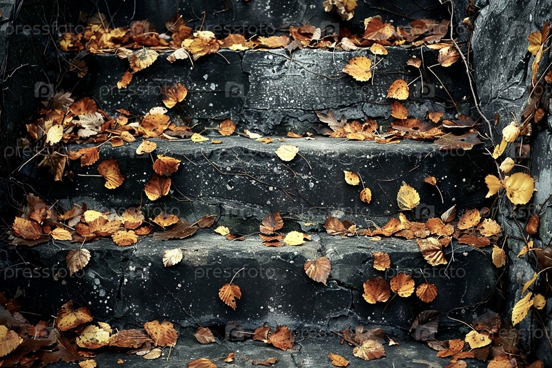 Крупный план каменных ступеней, покрытых осенними листьями