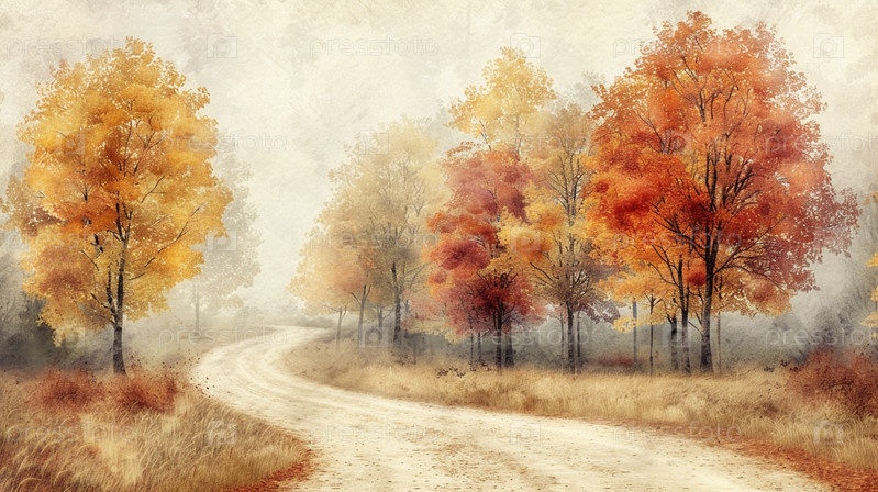 Осенняя картина, выполненная в стиле размытости, пустая грунтовая дорога, вдоль которой осенние желтые березы, красные клены и пожелтевшая трава