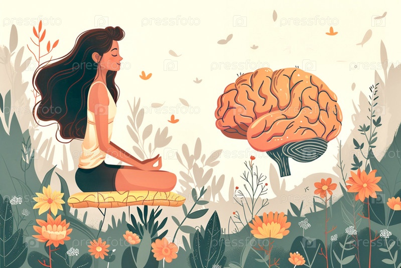 Стиль иллюстрации Девушка в позе йоги сидит перед человеческим мозгом на цветочном фоне, концепция спокойствия и управления эмоциями
