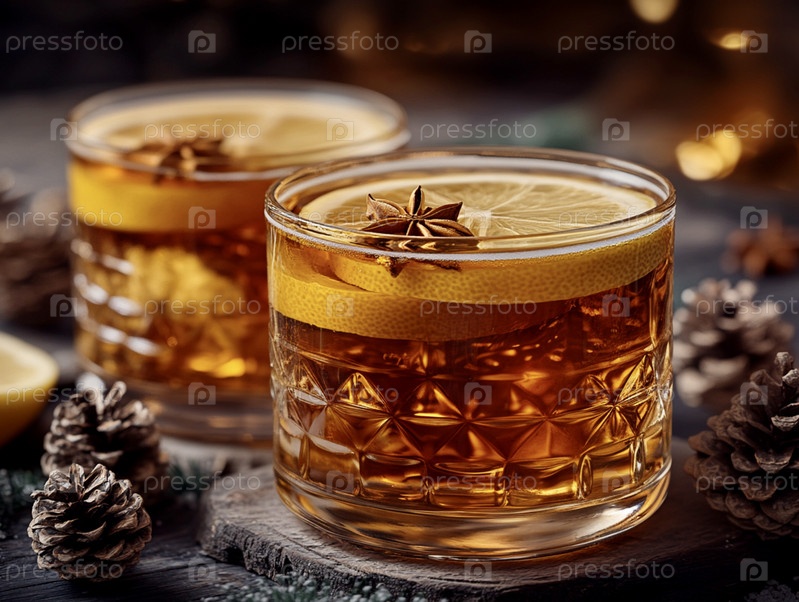 Уютная сцена теплого рождественского коктейля Hot Toddy с кусочками лимона, корицы и бадьяна на деревенском деревянном столе в окружении сосновых шишек и зелени.Концепция зимнего праздника