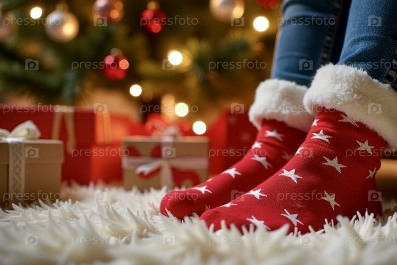 Крупный план красных праздничных носков с белыми звездами, рядом с упакованными подарками под рождественской елкой, теплая праздничная атмосфера, рождественская концепция