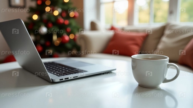 На светлом столе в гостиной, украшенной к Рождеству, стоит ноутбук и чашка кофе, рождественские интернет-покупки