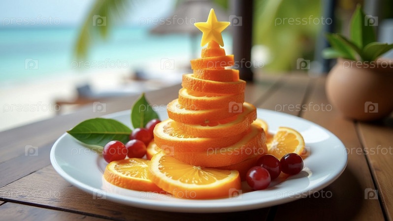 На белой тарелке выложена рождественская елка из свежих долек апельсина, зерен граната и винограда