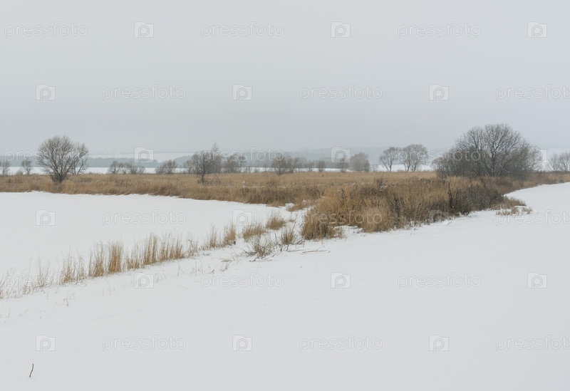 Островок сухой травы и деревьев посреди заснеженного поля
