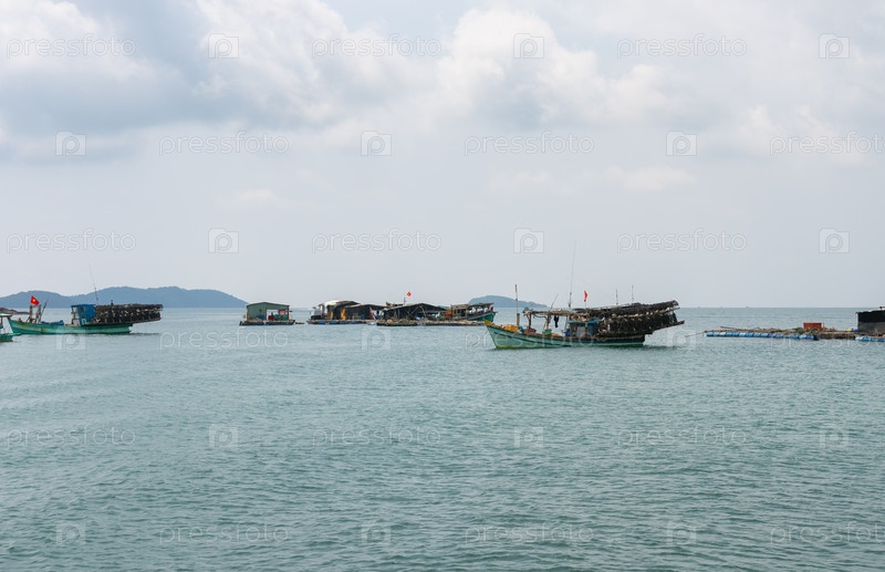 Вьетнамские дома на воде, рыбные фермы и рыбацкие лодки на фоне тропических островов