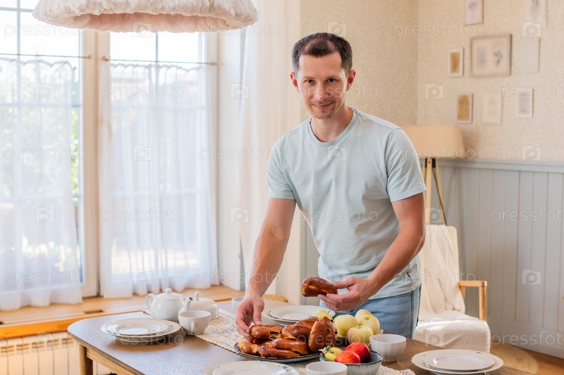 Молодой жизнерадостный мужчина на ходу берет со стола пироги на кухне загородного дома