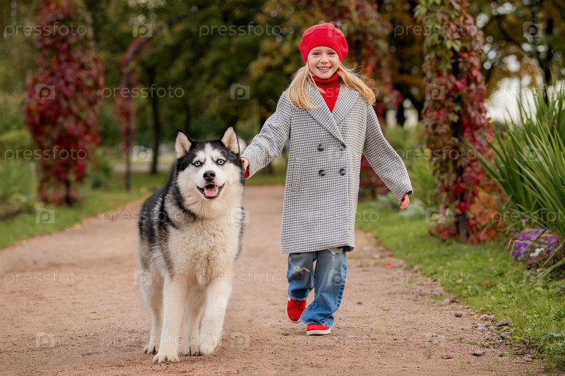 Маленькая девочка в красном берете и пальто бежит с собакой породы хаски на поводке по тропинке в осеннем парке