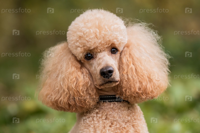 Портрет крупным планом очаровательной головы и мордочки персикового пуделя, смотрящего прямо вперед, на улицу