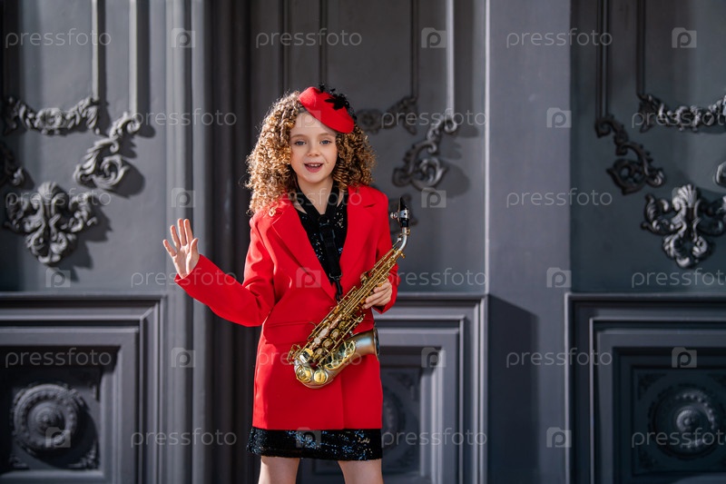 Молодая девушка в красном пальто и шляпе держит саксофон. Она улыбается и наслаждается собой. Концепция радости и игривости, так как девушка одета и играет на музыкальном инструменте