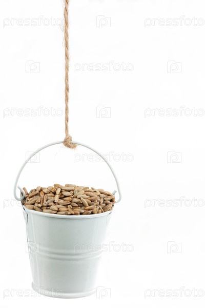 Полное ведро ржаных зерен, висящее на веревке