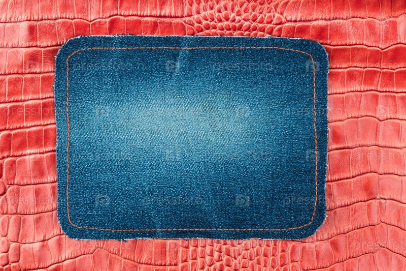 Пустая рамка из джинсов. Джинсовая заплатка с оранжевым нитевым швом на красной коже