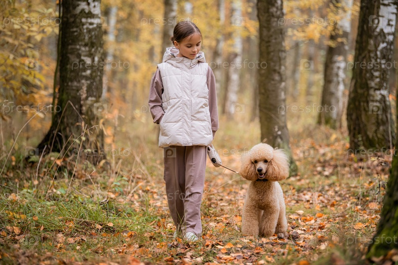 Маленькая девочка гуляет со своим пуделем персикового цвета в осеннем парке
