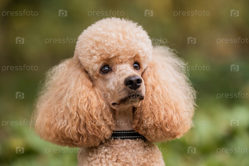 Портрет крупным планом очаровательной головы и мордочки абрикосового пуделя, смотрящего прямо вперед, на улицу