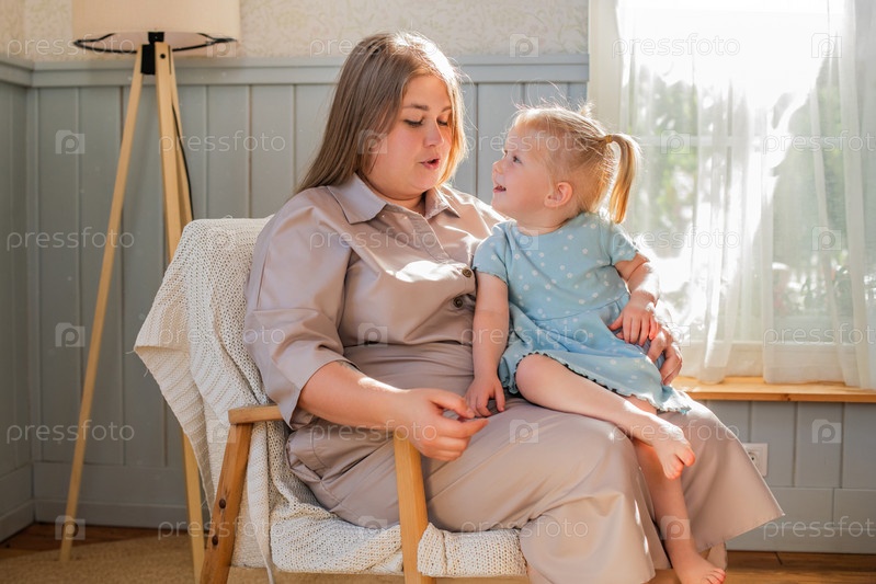 Мама с удовольствием играет со своей маленькой дочкой, сидя в кресле у окна