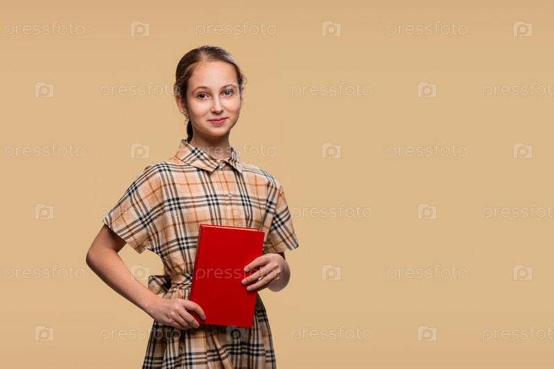 Портрет девушки в желтом клетчатом платье с красной книгой в руках на желтом фоне