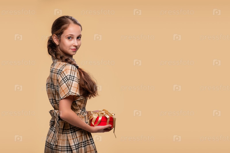 Портрет девушки в желтом клетчатом платье с красной подарочной коробкой в руках на желтом фоне