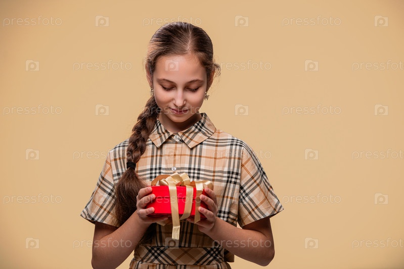 Портрет девушки в желтом клетчатом платье с красной подарочной коробкой в руках на желтом фоне