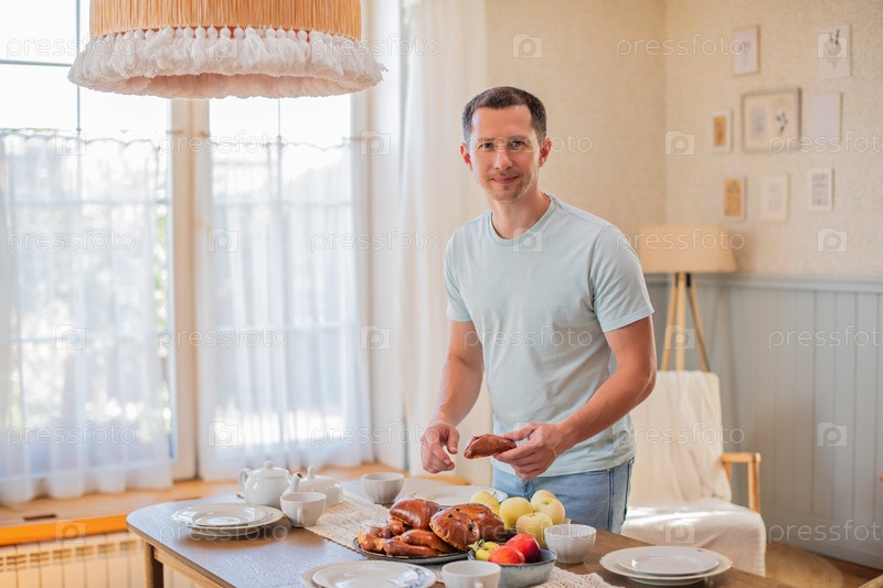 Молодой веселый человек на ходу берет со стола пирожки