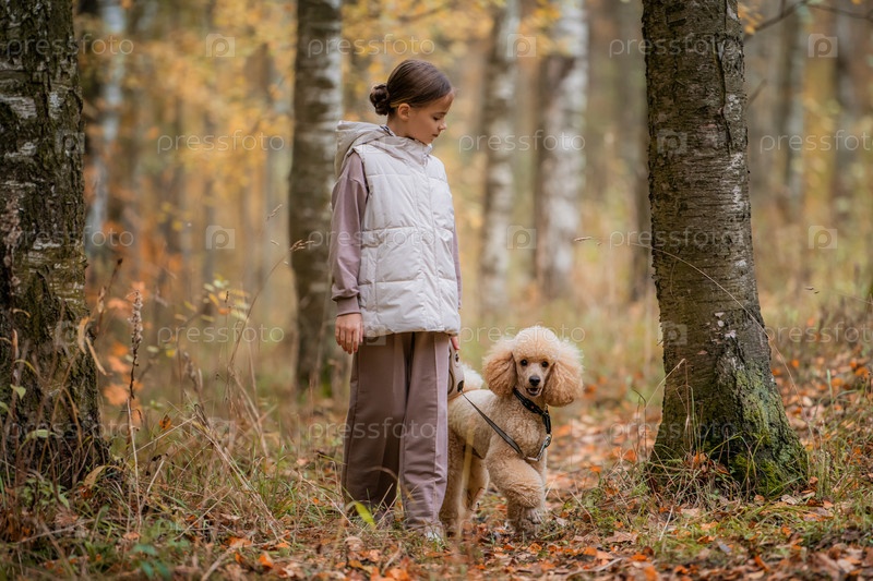 Маленькая девочка гуляет со своим пуделем персикового цвета в осеннем парке