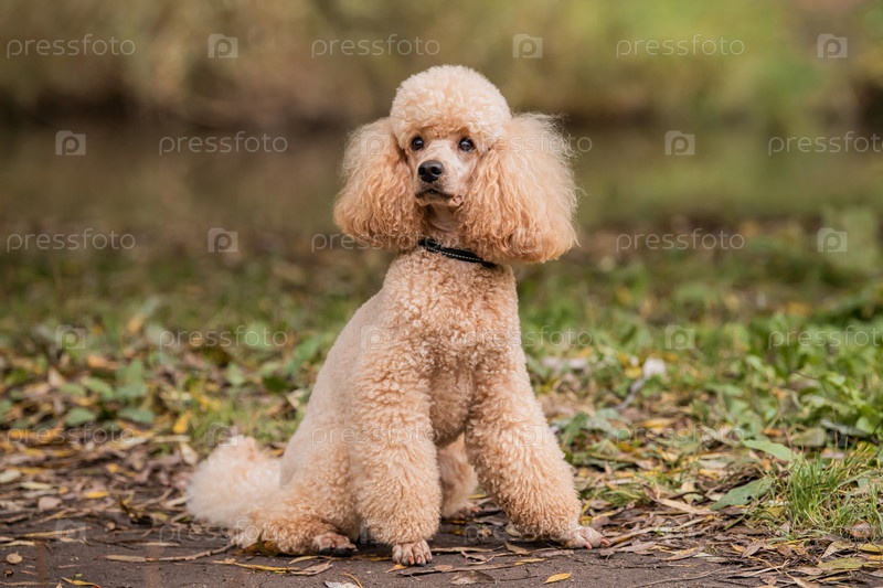 Портрет в полный рост послушного дрессированного сидящего абрикосового пуделя в осеннем парке. Образ жизни