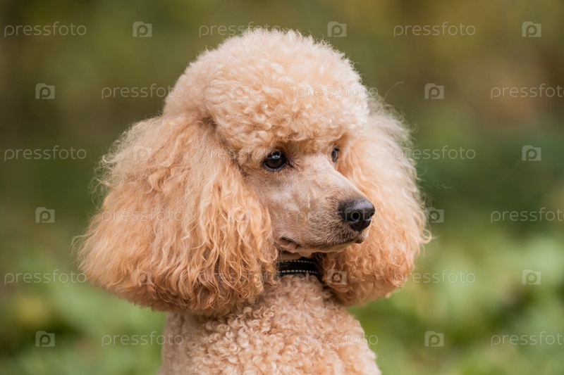 Портрет крупным планом очаровательной головы и мордочки абрикосового пуделя, смотрящего сбоку, снаружи
