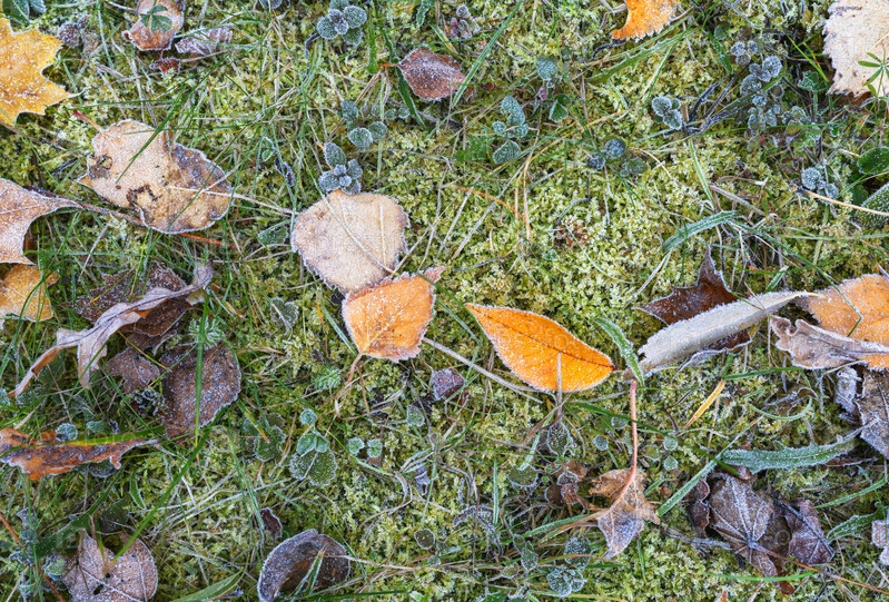 Опавшие листья лежат на траве, покрытые инеем во время заморозков поздней осенью
