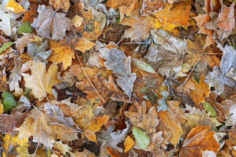 Ковер из покрытых инеем опавших листьев, осенний фон, текстура