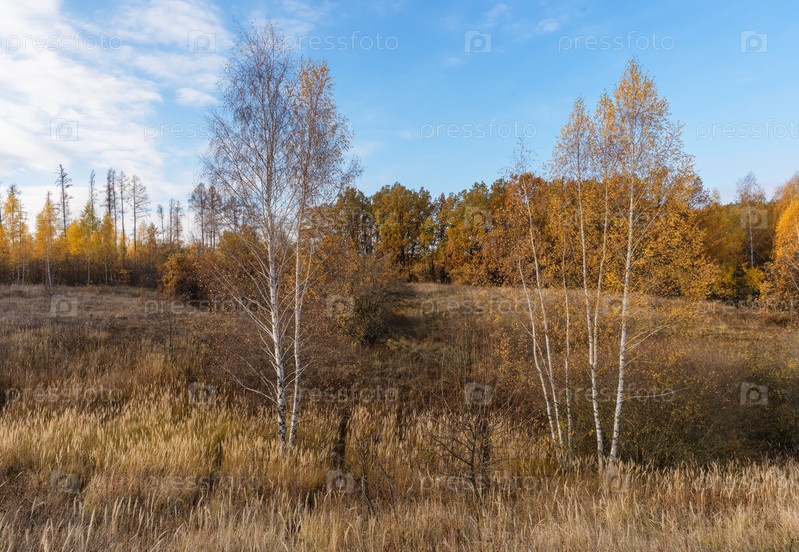 Березы с голыми листьями на фоне оранжевого осеннего леса