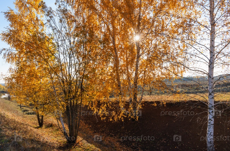 Осеннее солнце освещает желтую листву берез