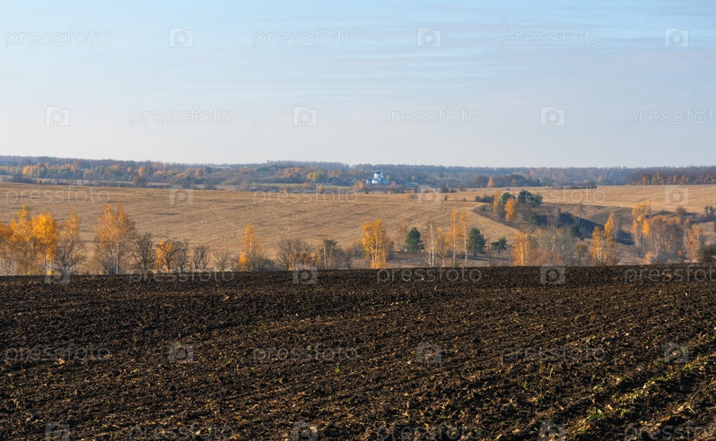 Вспаханное на зиму поле и осенний сельский пейзаж