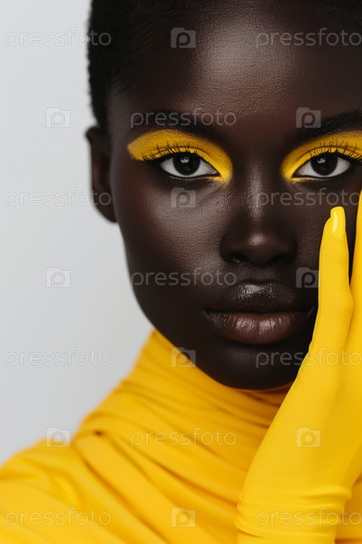 Афроамериканская девушка-модель в желтом свитере и желтых перчатках на светлом однотонном фоне